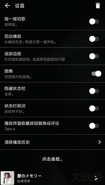 4、进入到设置页面之后,用户还可以尝试开启“摇一摇切歌”、“状态栏歌词”、“底部边距”等服务,从而获得更好的播放体验。