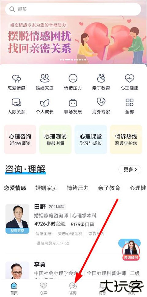 1、打开壹点灵心理医生,注册登录进入首页,首页有恋爱情感、婚姻家庭、情绪压力、亲子教育、人际关系等版块,点击咨询;