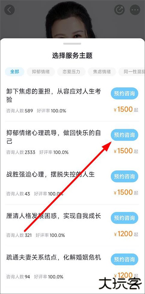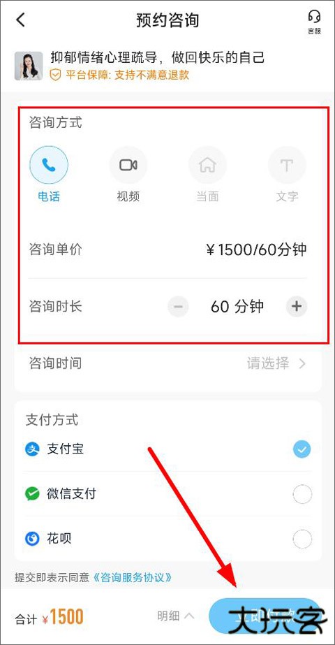 4、用户根据自身情况,选择预约咨询服务主题,选择咨询方式(电话、视频)、单价、时间,付款即可预约成功。