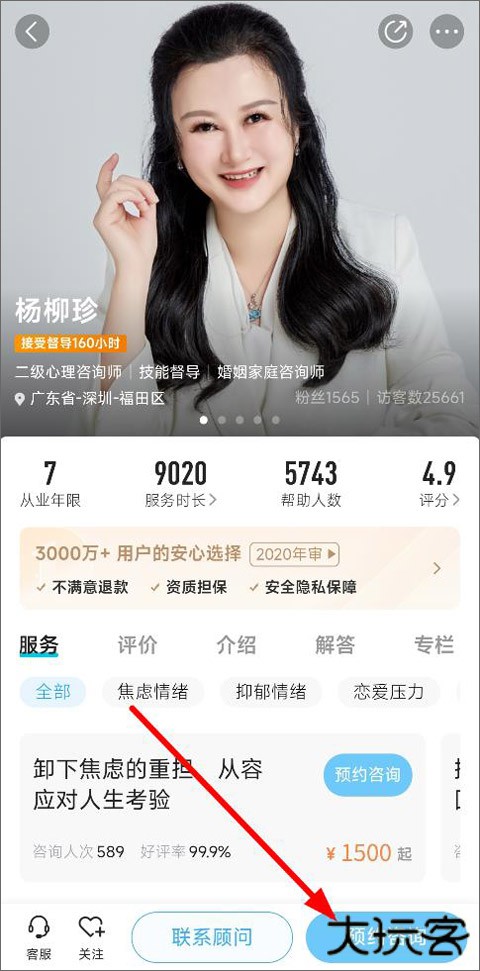 3、打开咨询师页面,可以查看咨询师基本信息,包括姓名、地址、从业年限、擅长技能、服务人数等,用户可联系顾问或预约咨询;