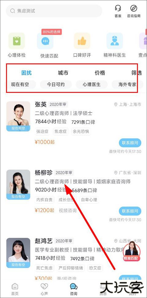 2、进入咨询页面,用户可按照自己的需求查找心理咨询师咨询(按困扰分类、城市、价格筛选);