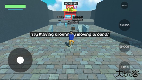 5、进入关卡后操控卡尔森移动:使用左屏摇杆移动角色,右屏按键控制攻击、跳跃等动作。目标是要让卡尔森顺利到达关底的商店才算过关哦。