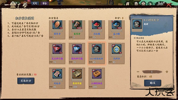 离线挂机会消耗道具“离忧令”,任务会给100个,如不够可以在名山村内NPC“杂货商”处或武昌城内NPC“杂货李”处购买(1000铜币15分钟离线时长)。