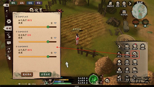 1、新人刚进游戏第一件事,找到主页面右侧”设置”按钮,进入页面。依次设置好自动吃药-自动开启身法-自动开启护体(非常重要。。。)