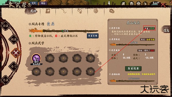 7、随着武学熟练度的提升,不同的熟练度需要打相应的怪物获得满额经验(如当前打的怪没有获得满额经验,会在经验获取那有红色向下箭头表示你应该更换其他怪物打)