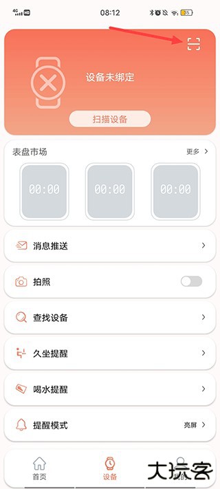 1.下载并安装RDFit手表app,完成后打开软件注册登录后,点击设备界面右上角的扫描框