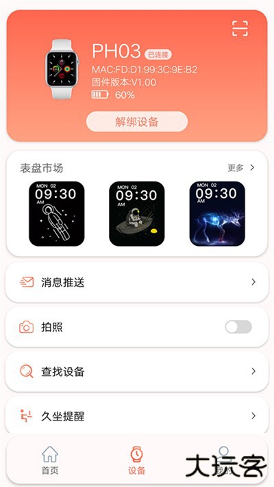 3.在设备界面绑定设备后,可以对设备进行功能操作如表盘切换、拍照等功能