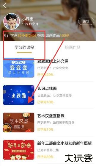 3、在个人中心页面,查看累计学时与完成作品数量,点击学习的课程板块,找到变变变线上补充课等课程,点击进入继续学习绘画知识。