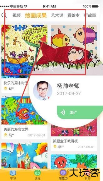 2、进入绘画成果展示页面,浏览杨帅老师等作者分享的海底世界等绘画作品,可点击作品查看详情,感受不同绘画风格与创意。