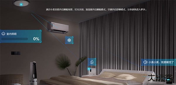 通过小美音箱开启睡眠场景,灯光关闭,加湿器开启睡眠模式,空调开启舒睡模式,让你更快进入梦乡。