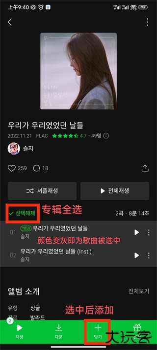 3、之后全选专辑,当颜色变灰即为歌曲被选中,选中后点击添加;