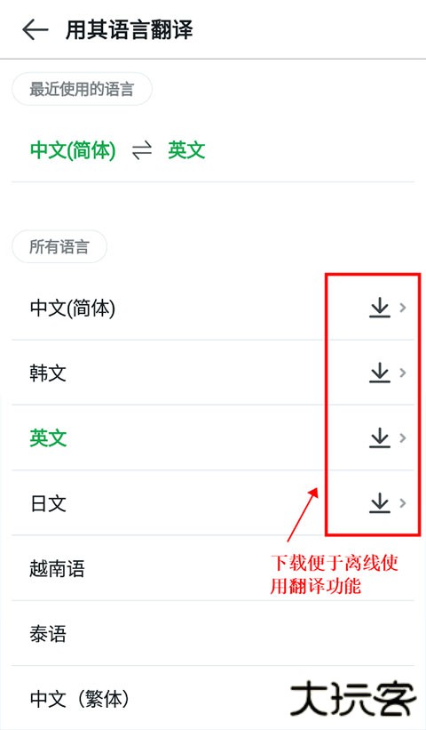 2、点击上方相对应图标即为对应翻译功能,例如“中韩翻译”,如果想要离线使用翻译功能,可以选择是否下载语言包,如下图: