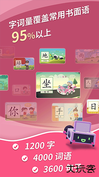 3、多维度识字训练:支持“以形认字、听音辩字、汉字讲解、汉字描写”等多种学习方式,涵盖1200个汉字、4000个词语及3600个句子,覆盖常用书面语95%以上。