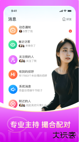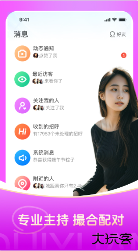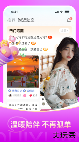 4、基于地理位置、兴趣标签及择偶标准推荐附近异性,支持文字/语音/视频聊天及动态分享,结合AI算法提升匹配精准度。