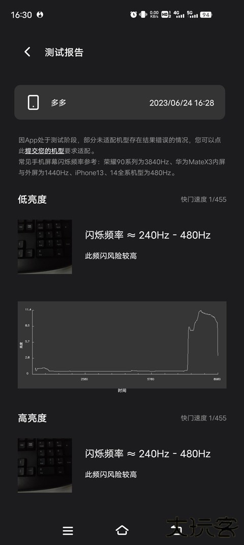 结果包括频闪的频率、曲线,还有根据算法得出的风险评价,大家就能知道自己用的屏幕有没有频闪风险了。