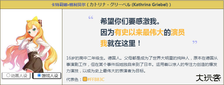 16 岁高中二年级学生,德国籍。出身于父母均为世界级明星(纯种人)的戏剧世家,原于德国从事演剧,因故独自赴日。以成为史上最伟大表演者为目标,擅长运用惊人专注力激发爆发性演技。能力 “零之幕间”(Konzentration)可在精神高度集中时,令体感时间趋缓,实现瞬间角色信息输入并施展爆发性演技。该能力如同其名发音(Concentration)要求极度专注,一旦分心即被打断,性质为双刃剑。偏好剧目为《灰姑娘》(シンデレラ),喜爱幻想的动物是龙。