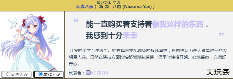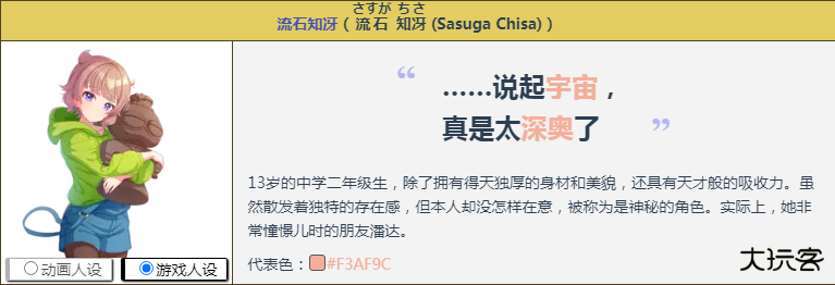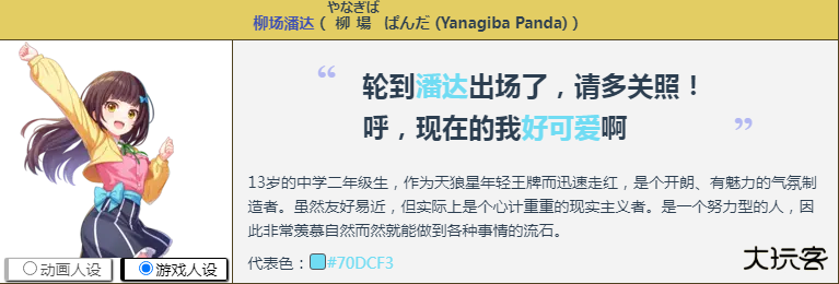 虽然散发着独特的存在感,但本人却没怎样在意,被称为是神秘的角色。实际上,她非常憧憬青梅竹马柳场潘达。