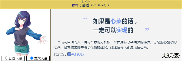 形象为充满自信、具备冷静分析能力的少女,补足了凤心菜缺失的特质。时常担忧胆怯的心菜,给予鼓励与恰当建议,是对心菜抱有最深信任的角色。实为凤心菜个性能力的具象化实体,在心菜经历多次试镜失败后出现。偏好剧目为《银河铁道之夜》(銀河鉄道の夜),喜爱动物是猫头鹰。