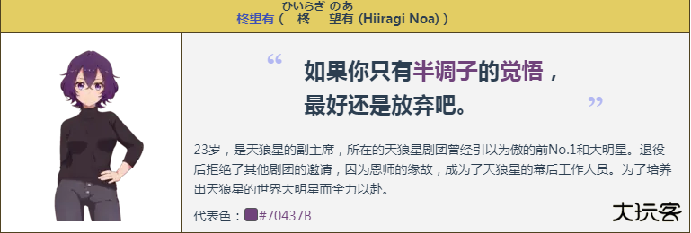23 岁,现任天狼星剧团副主席。曾为剧团引以为傲的前代首席明星(No.1)。退役后婉拒其他剧团邀约,因感念恩师选择留在天狼星从事幕后工作,倾力培养剧团新生代世界明星。能力 “你的特长”(ハイライト)具备一定程度洞察演员技能与资质的能力,并能提携共演者,使其表现更为突出。偏好剧目为《小美人鱼》(人魚姫),喜爱动物是柴犬。