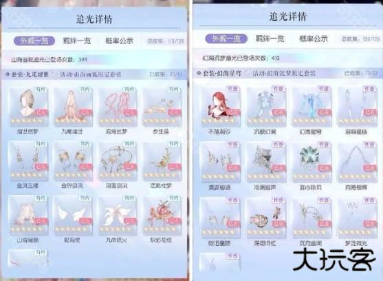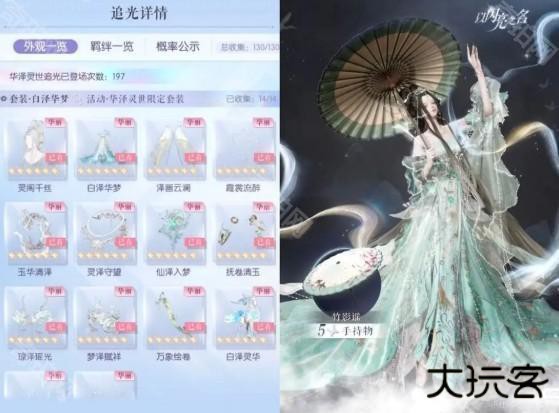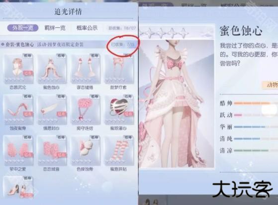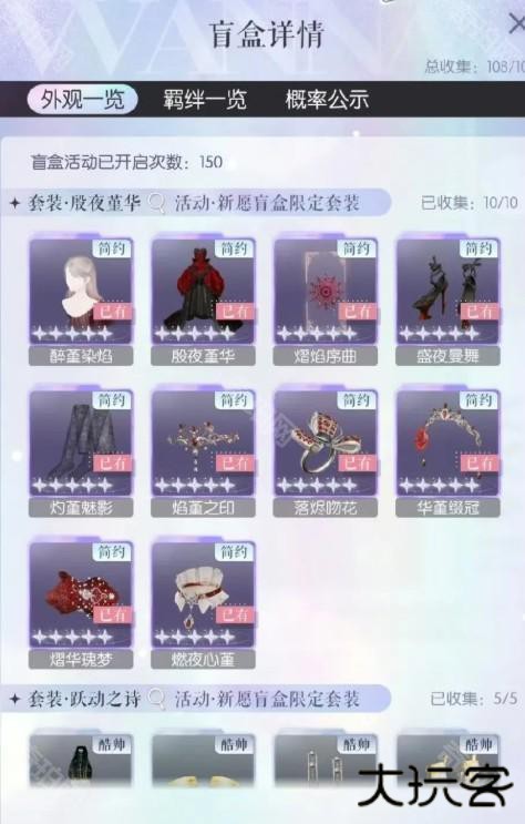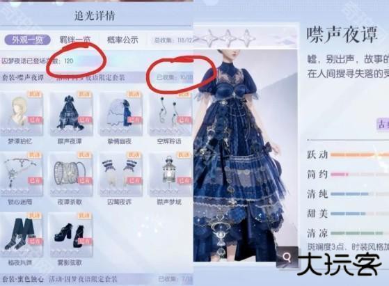 在抽阁时保底50抽必出其中一套五星裙,概率50%随机其中一套,出裙后套装部件概率up,所以一般双五阁80抽齐一套,小于80抽算欧。一般150抽齐两套,小于150抽算欧,非一点160抽也有。图5,我目前抽了120抽,出的保底裙是提灯套,所以很早就齐了。双五阁欧皇可能130抽以内齐。