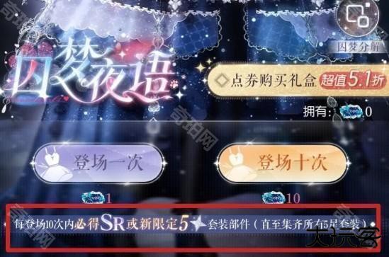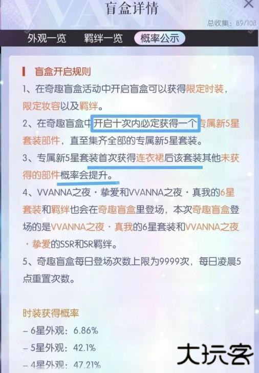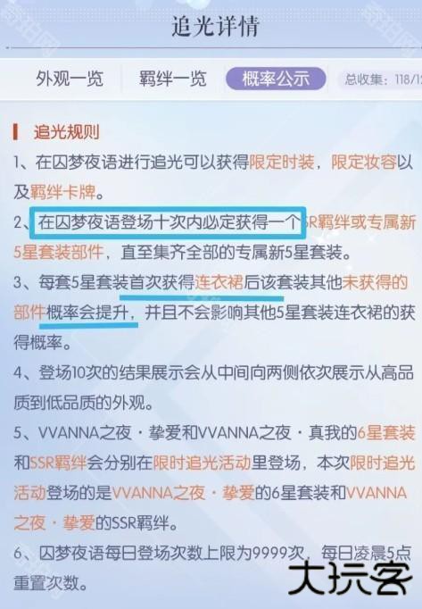 以本次新限时阁【囚梦夜语】为例:重点看图2的第2条,第3条,在双五阁抽阁保底机制是10抽必出限五套新部件,SR羁绊卡占保底。