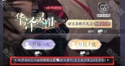 游戏内六星阁抽阁机制介绍,六星阁抽阁保底25抽必出限定新六部件。获得保底主件如六星套大裙子,六星套上装或下装,概率up。