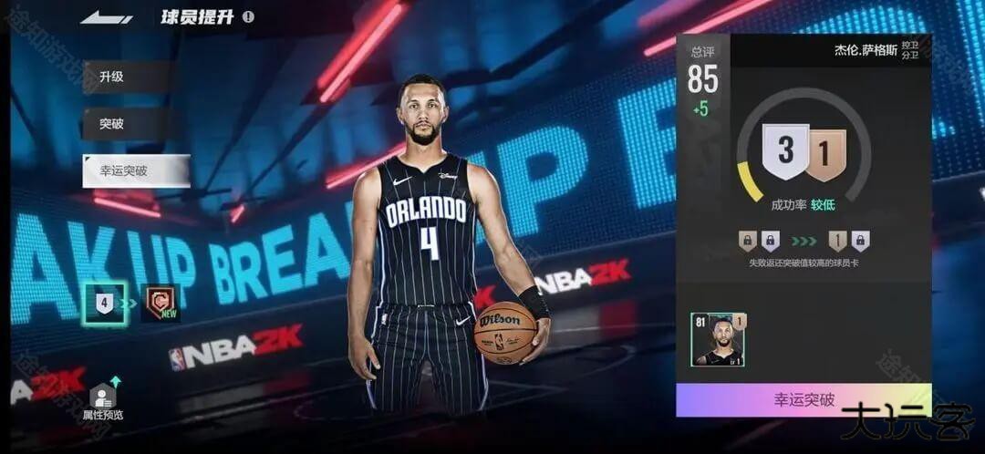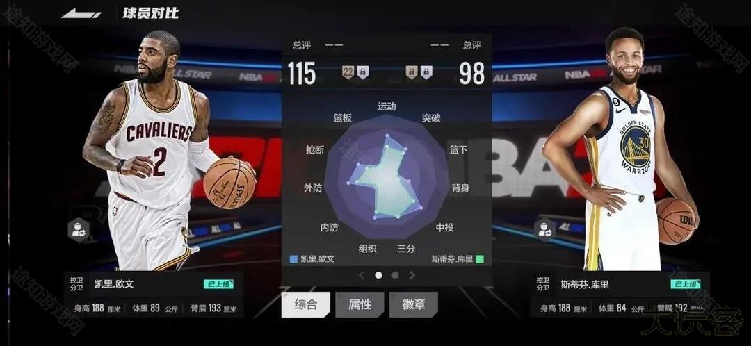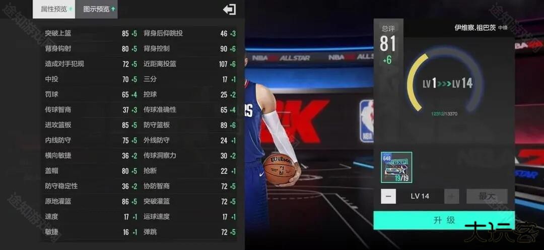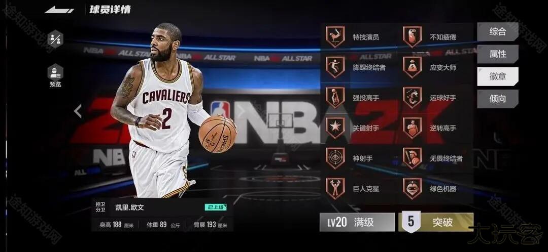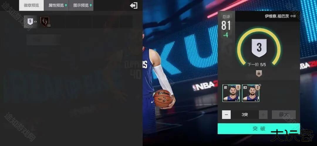 ①主页球员点击所选球员后进入球员详情,左侧点击预览,可以查看球员各等级、突破的综合、属性、徽章等数值。