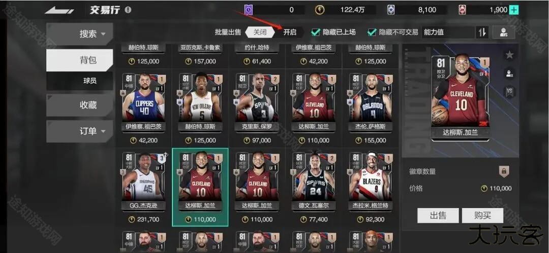 ④背包上方可以开启批量出售,选中不同的球员同时上架出售,提高效率