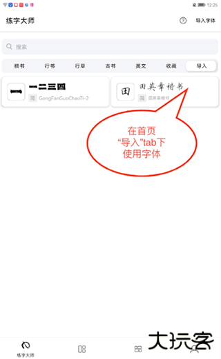 5、导入成功后,在练字大师首页“导入”页面查看并使用导入的字体。