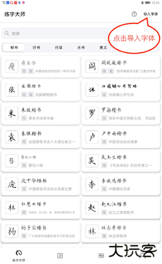 2、之后打开练字大师app,点击首页右上角的“导入字体”按钮。