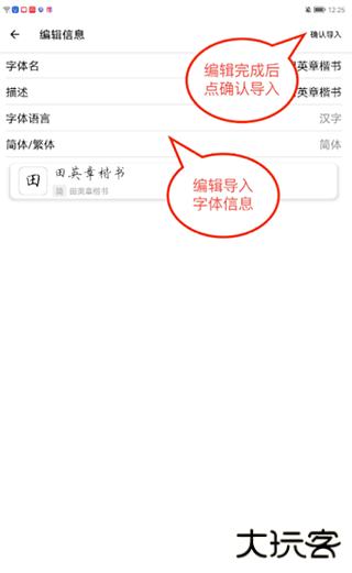 4、编辑导入字体的信息,并“确认导入”。