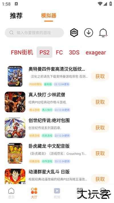 支持多种游戏平台,如 PC、安卓、ps2、3ds、gba、fc、nds、psp、街机等