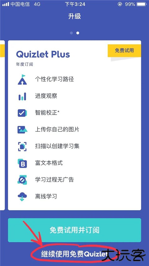 3、注册完成后,它会自动跳出一个升级会员的页面,不需理睬,直接点击最下方的"继续使用免费Quizlet"。