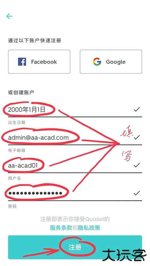 2、输入自己的"出生日期"、"电子邮箱"、"用户名"和"密码"后,点击"注册"
