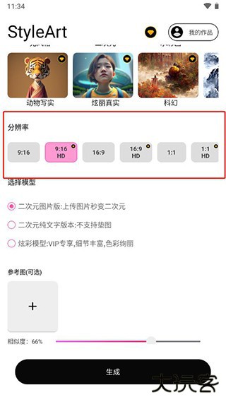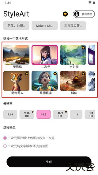2、接着可以选择一个艺术形式,比如二次元、水彩画、动物写实、科幻等等;