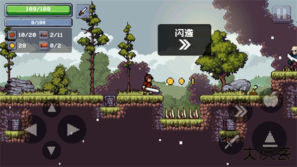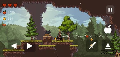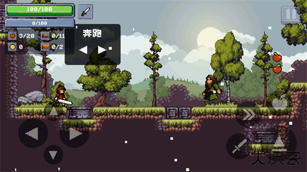3、然后可以点击“剑”图标,就能使用武器攻击敌人,记得收集掉落的苹果。