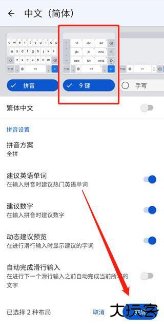 5、顶部就可以看到九键的标识了,点击就可以增加九键,如果不需要全键盘也可以取消勾选全键盘,只用九键,设置完成后,点击底部的完成即可。