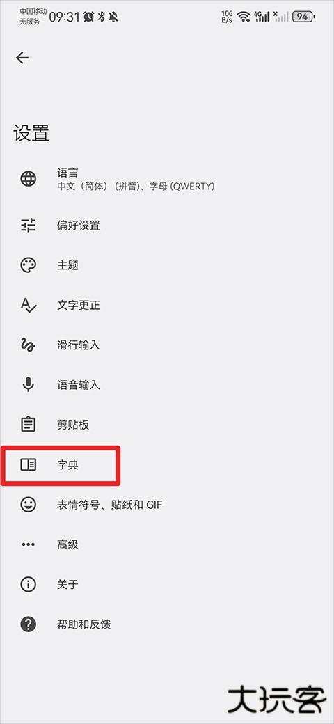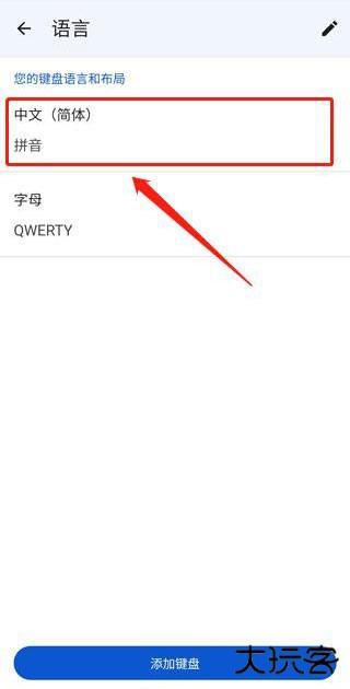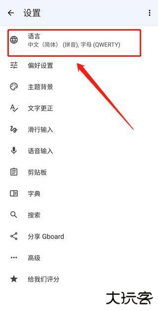 3、这个时候就可以看到谷歌键盘的基本设置了,点击顶部的语言;