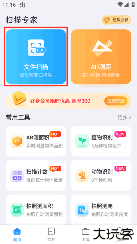 1、打开下载好的应用,在首页就能开始操作了,这里举例的是文件扫描,先选择并点击红色方框内的区域选项