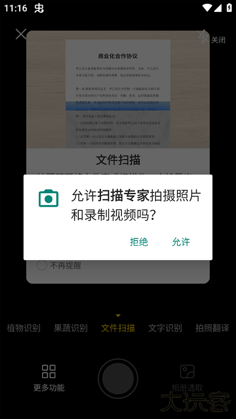 2、在扫描界面先给予应用拍摄照片和录制视频的权限,把文件对齐扫描框