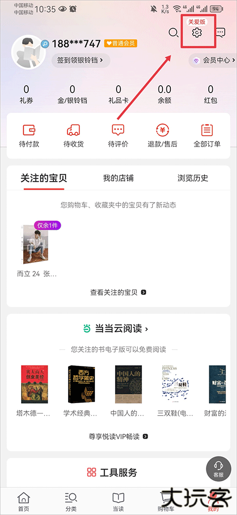 1.打开当当网app后,在我的界面中点击右上角的设置选项