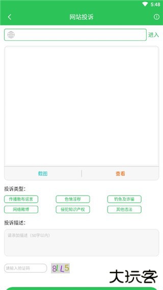 2、点击网站投诉,然后输入违规网站链接,上传截图,选择违规类型,添加描述后点击提交