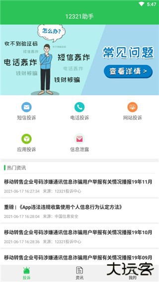 1、打开12321举报助手APP,点击想投诉的内容(短信/电话/网站/应用)