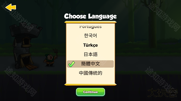 1、在本站下载并安装游戏后打开游戏,首次进入游戏可以设置游戏的语言,只需下拉找到简体中文点击Continue即可。