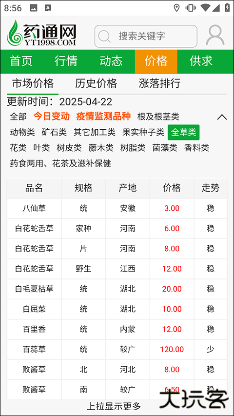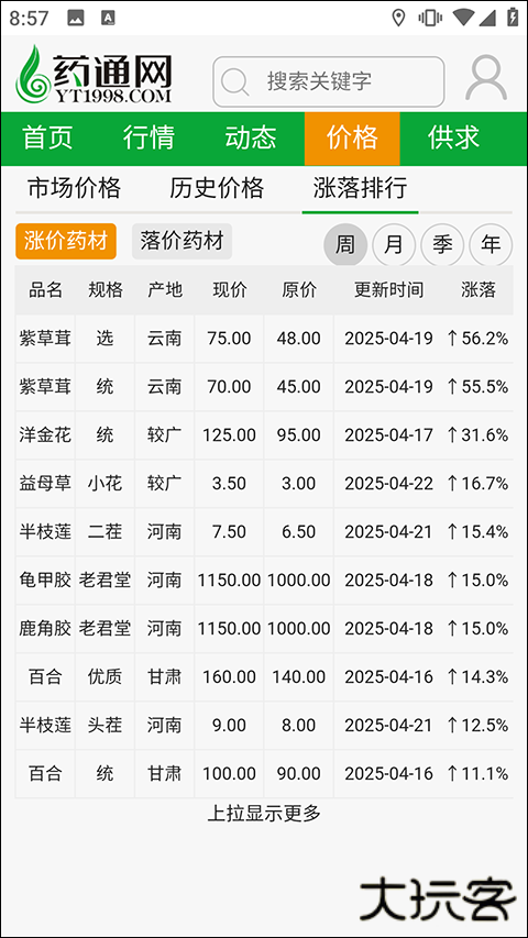 4、以及点击涨跌排行观察各个中药材的最近涨落情况。