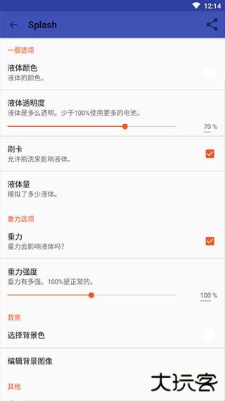 5、发现可以设置液体颜色、透明度、液体的量等液体选项,还有重力选项,最后是背景选项