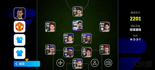 6、完成球员招募后,根据球员特性及战术需要,在预设阵型中对十位球员的具体场上位置进行配置与调换。