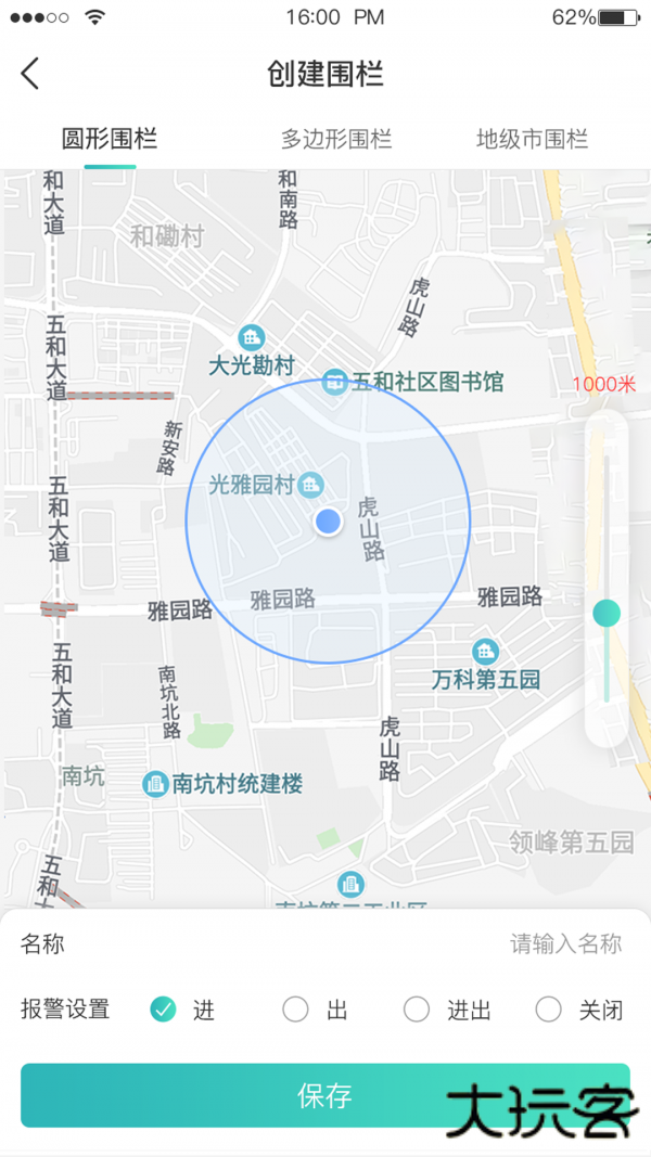 6、电子围栏:设置圆形监控范围,车辆越界自动报警。