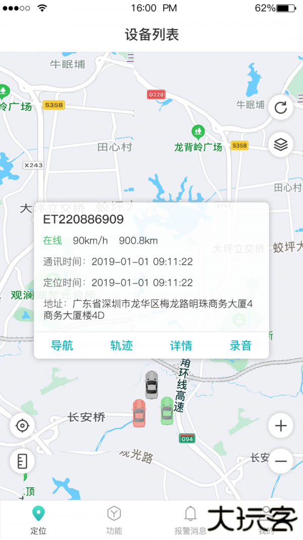 3、实时定位:通过GPS在地图上显示车辆当前位置,包含经纬度、行驶方向等详细信息。