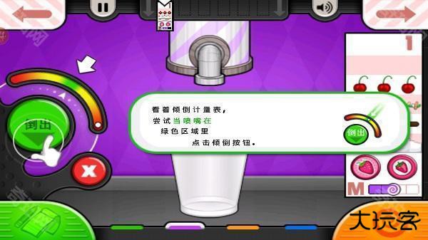 看着倾倒计量表,尝试当喷嘴在绿色区域里,点击倾倒按钮。